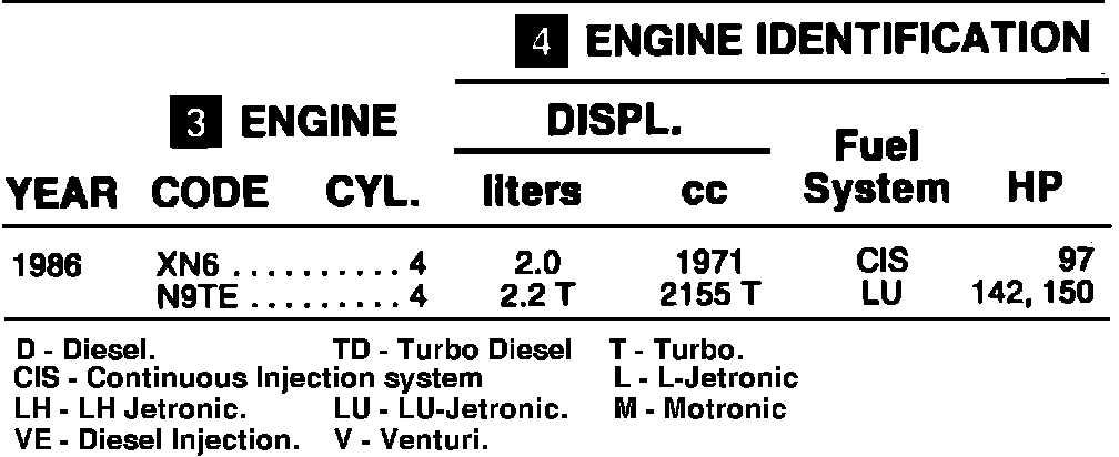 1984-81 - 6th character of VIN. All others - Prefix to engine number, stamped on engine block.