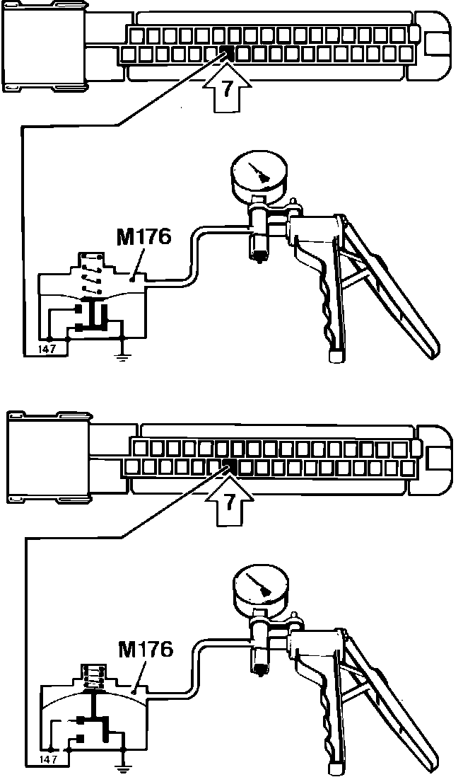 2. Disconnect vacuum hose (green) from the full load vacuum switch (M176), Fig. 25, and seal off the open end of the hose. The reading on the OCR tester must be at 35% (31° to 32° on dwell meter).