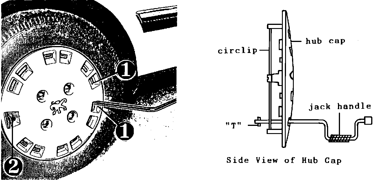Insert vehicle's jack handle into one of the two slots (1) opposite the valve slot (2), making sure that the "T" of the jack handle is lodged behind the hub cap's circlip. This will cause the circlip to compress when pulling on the jack handle, thereby releasing the hub cap. If the "T" is not lodged behind the circlip, the pulling of the jack handle against the plastic may cause the hub cap to break.
