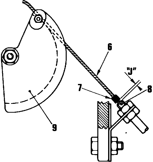 5. With throttle in idle position, tighten control cable (6), Fig. 5, to obtain maximum of .5 mm (.020 inch) play (J) between sleeve (7) and cable housing ferrule (8).