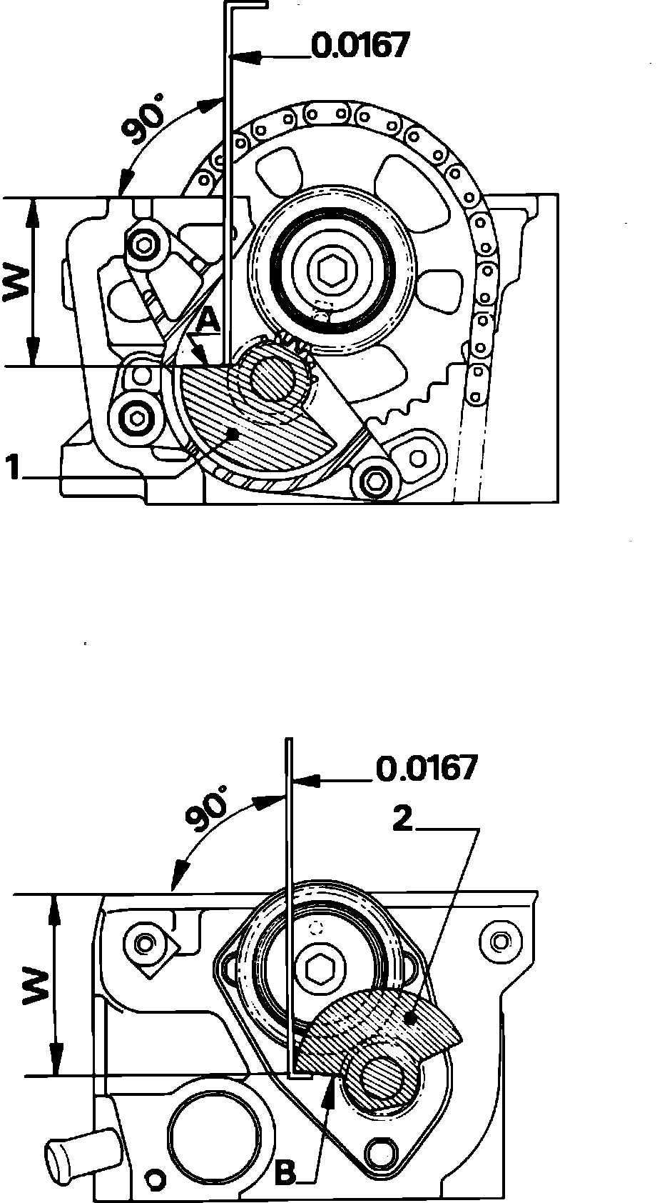 c. Check distance W between counterweight faces (A) and (B) and valve cover gasket plane of the cylinder head. This distance must lie between gauge marks; if not, carry out counterweight setting procedure. A counterweight set incorrectly by one tooth will cause a .2-.4 inch variation in distance W depending upon point of measurement on counterweight.