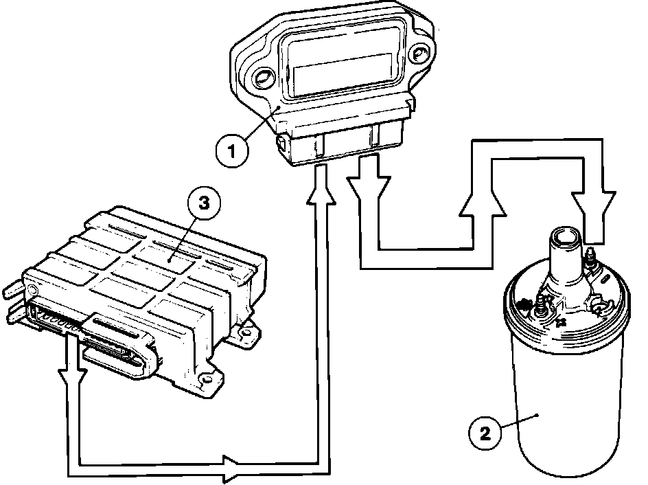 The ignition amplifier (1) functions as an electronic switch controlling the current in the ignition coil on command from the ECU (3). This function is comparable to the operation of the points in a mechanical ignition system, in that it opens and closes the coil primary ground connection.