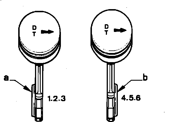 2. Install connecting rods to pistons noting the proper orientation for left bank (pistons 1, 2 & 3) and right bank (pistons 4, 5 & 6), Fig. 50, then install oiled piston pins and circlips. Maintain proper piston/piston pin matching.