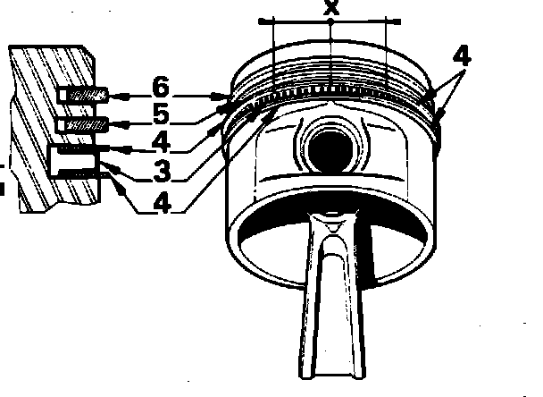 6. Install piston rings (5) and (6) at 120° from each other with TOPC and PC marks facing up.
