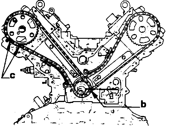3. Rotate crankshaft to bring mark (b) in line with oil pump assembly hole, Fig. 56. Install right camshaft pinion and chain (double marking (c) on timing gear pinion), then load the chain tensioners.