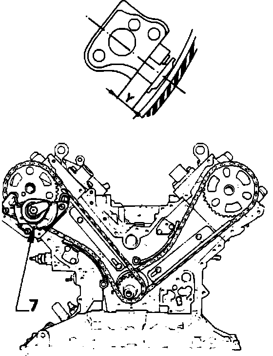 7. Remove valve covers, timing chain housing and crankshaft key. Measure deflection of (X) of oil pump chain. If it is greater than 2.8 inches, replace chain.