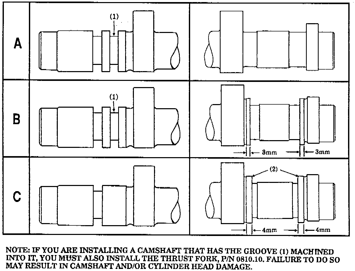 Please note the drawings. Camshafts type A and type B have a groove (1) machined into the timing belt end just ahead of the number four cylinder's exhaust lobe. This groove is used by the thrust retaining fork, P/N 0810.10, to maintain the camshaft's position in the cylinder head. Camshaft type C does not have this groove, and therefore, does not use the retaining fork. This camshaft is located in the cylinder head by two thrust bearing surfaces (2) machined into the number one journal at the distributor end (see Service Bulletin Number 456, Class 1, dated September, 1993 for additional information on interchangeability).