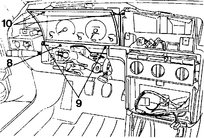 - Remove the two # 15 torx screws (10); tilt the instrument cluster toward you and disconnect the electrical connectors and speedometer cable