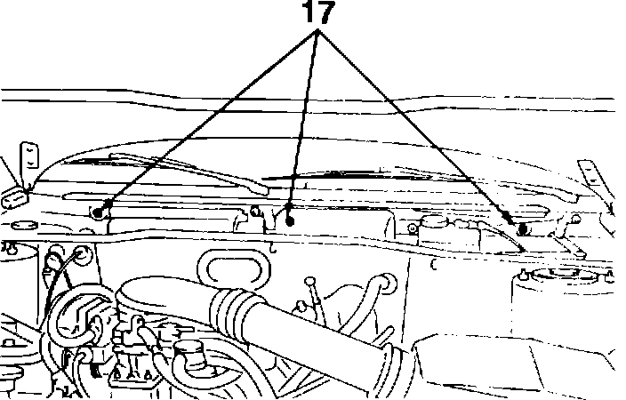 - Remove the three nuts (17) securing the dashboard to the firewall. This is most easily accomplished by using a 10 mm socket with a universal joint and a long 1/4" drive extension