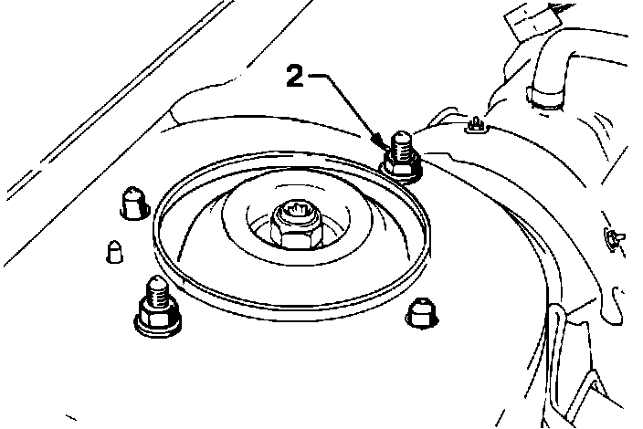 Remove the 13 mm nut (2) closest to the engine compartment side of the shock tower