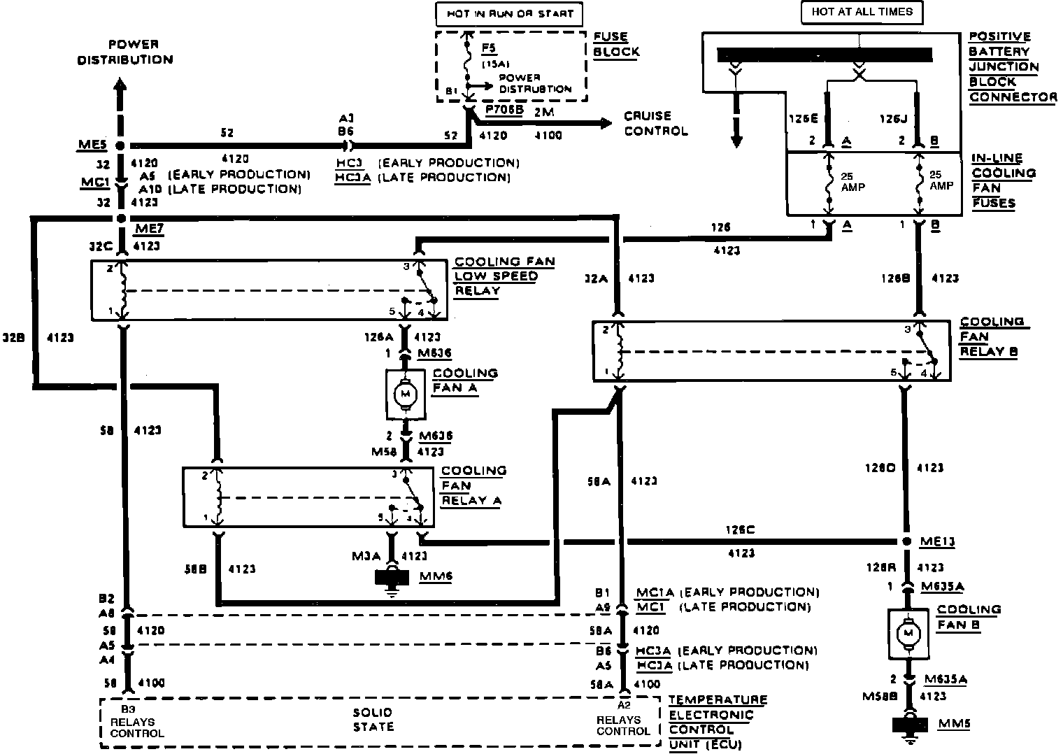 When the ignition switch is in Run or Start, fuse F5 applies voltage to the cooling fan low speed relay, cooling fan relay A, and the cooling fan relay B, Fig. 1. The positive battery junction connector applies voltage at all time to the cooling fan low speed relay and the cooling fan relay B.