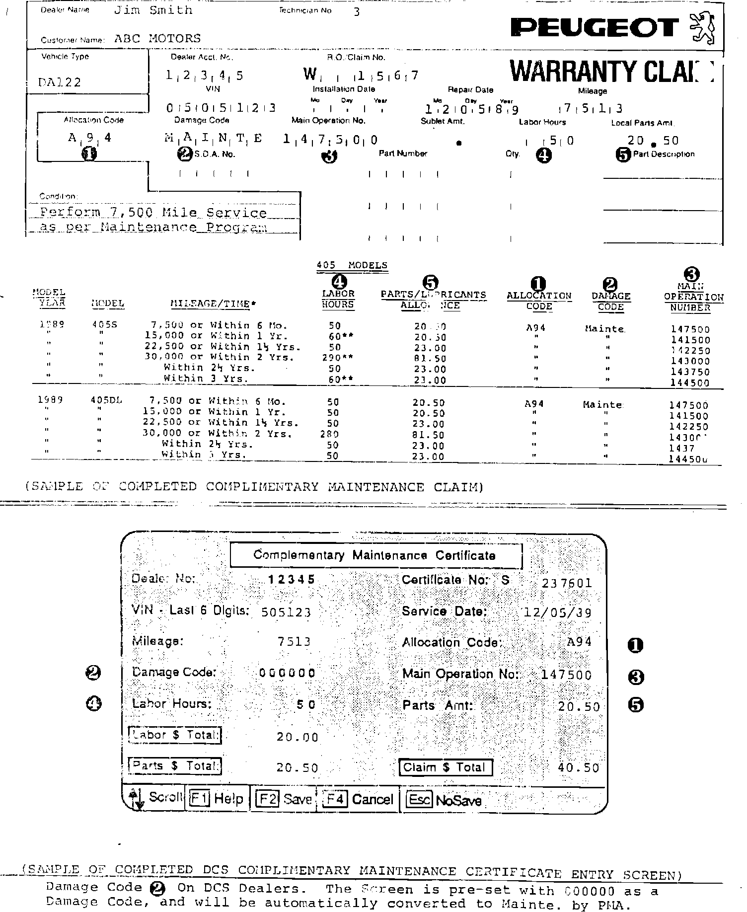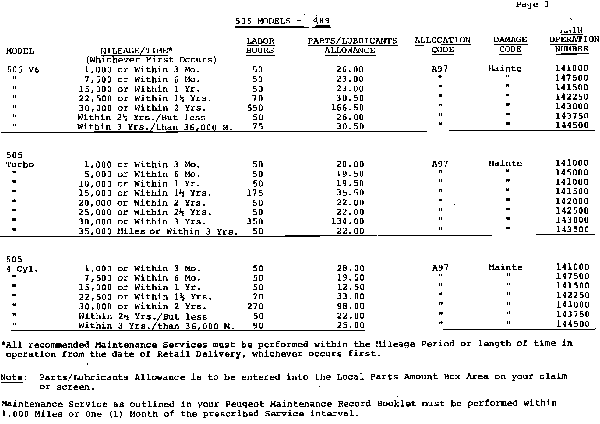 On the reverse side of this Bulletin, we have listed all of the Labor Hours, Parts and Lubricant Allowances, Allocation Codes, Damage Codes, and Main Operation Numbers which will be required in order to properly complete and submit a Warranty Claim for the services provided. On page 4 we have included a sample copy of a completed Complimentary Maintenance Claim.
