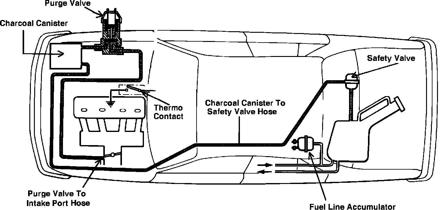 This system, consists of a non-vented fuel cap, charcoal canister, routing hoses, safety valve, thermocontact switch and an electric purge valve. The canister contains activated charcoal and is mounted on the right front side of the engine compartment. A hose connects the charcoal canister to the electric purge valve and another hose connects the electric purge valve to the intake system.