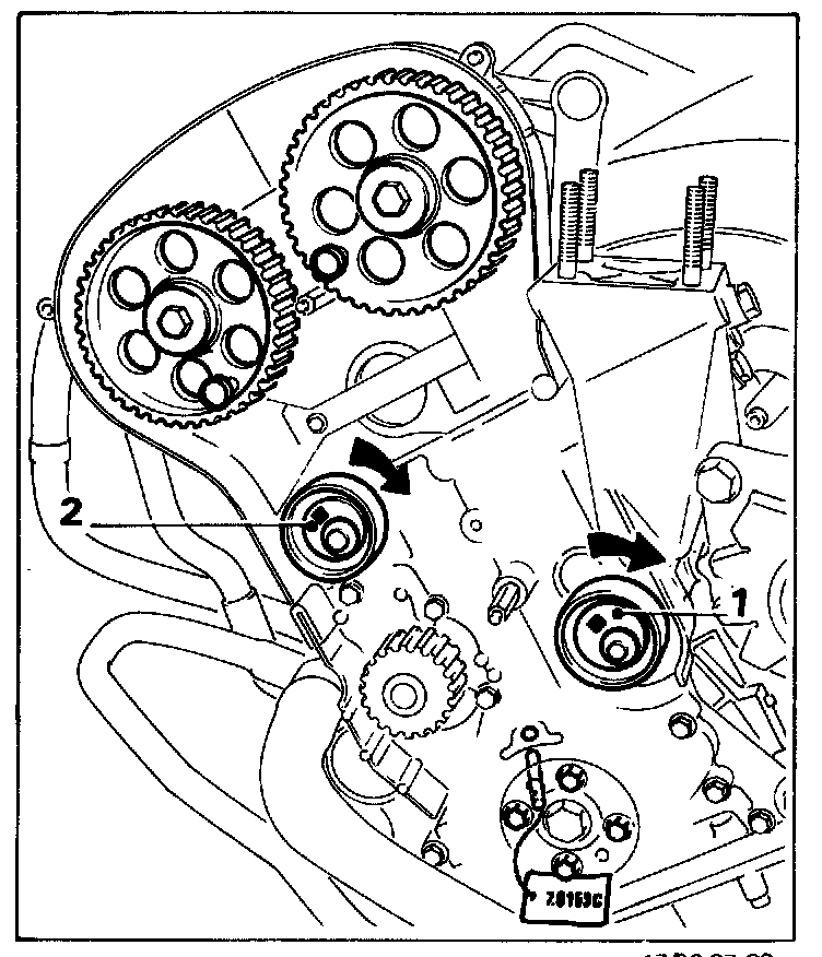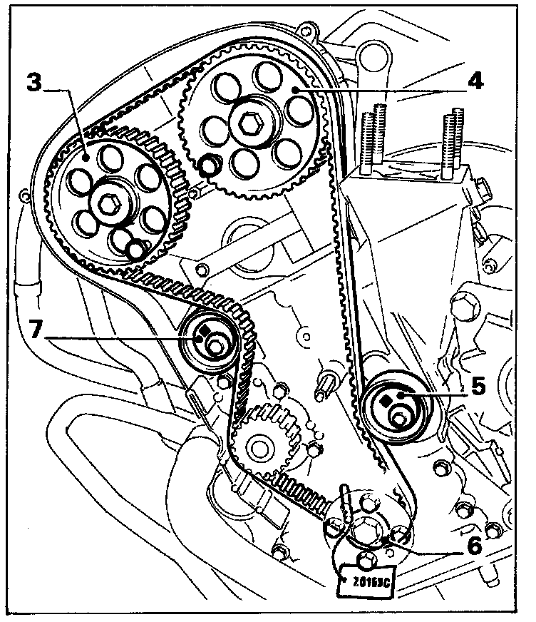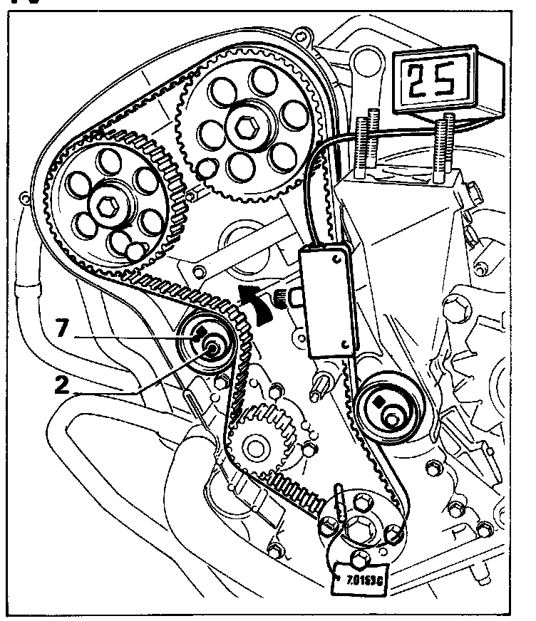 - Using tool (-).0153 P, rotate tensioner (5) one full turn.