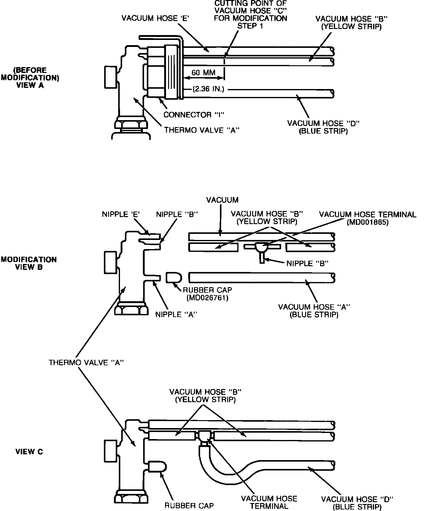 A. Remove connector "I" from thermo valve "A" and cut all three hoses off of connector "I". Reinstall upper vacuum hose "E" on thermo valve nipple "E" (Figure 1, Views A and B).