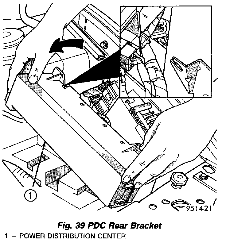 7. Pull PDC rearward to remove from front bracket. Lay PDC aside to allow access to Powertrain Control Module (PCM).