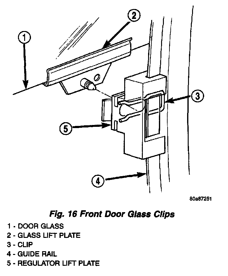 2. Remove door glass retaining clips and secure the window in the up position using masking tape or equivalent (Fig. 16).