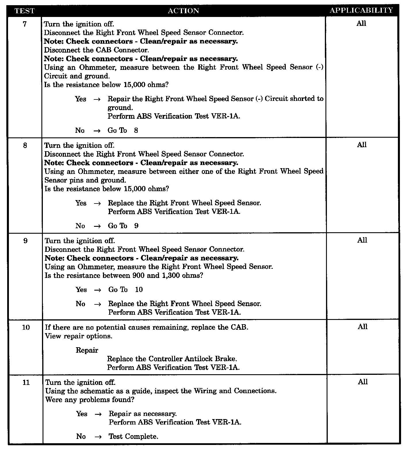 RIGHT FRONT WHEEL SPEED SENSOR DEFECTIVE (RESISTANCE)