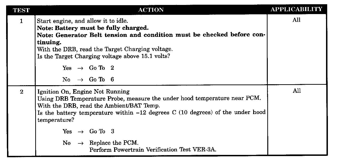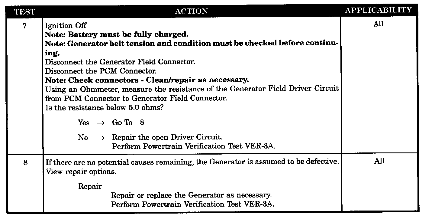 The battery sensed voltage is 1 volt below the charging system goal for 25 seconds. The PCM senses the battery voltage, turns OFF the field driver and senses the battery voltage again. If the voltages are the same, the code is set.