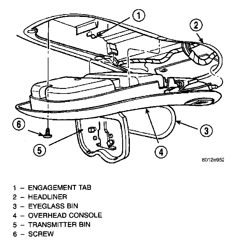 3. Remove screw holding the overhead console to the headliner. With the screw removed the console is retained by one engagement tab located inside the eyeglass storage bin.