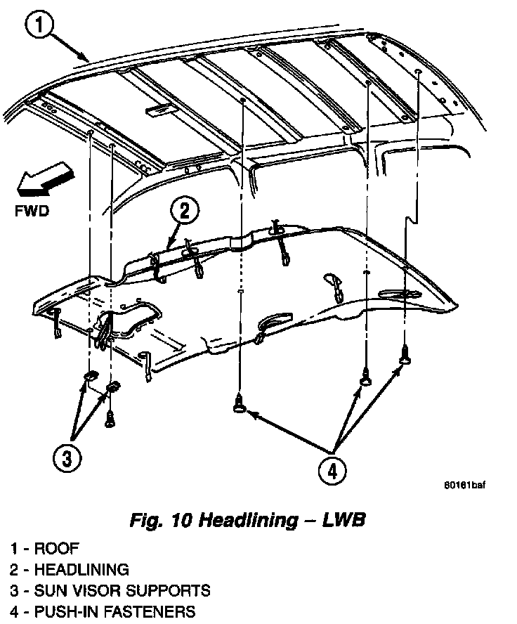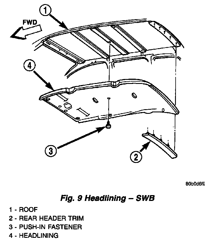 13. Remove push in locking fasteners attaching headlining to rear roof header and roof bows (Fig. 9) or (Fig. 10).