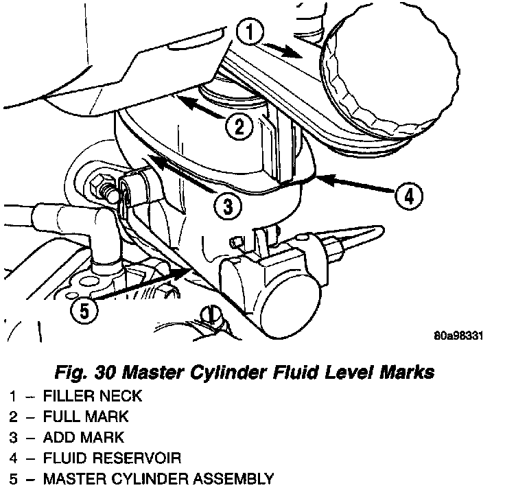 Master cylinder reservoirs are marked with the words FULL and ADD to indicate proper brake fluid fill level of the master cylinder.