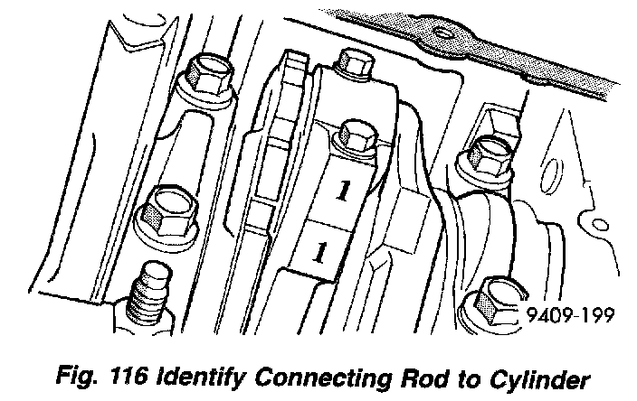 2. Remove oil pan. Scribe the cylinder number on the side of the rod and cap (Fig. 116) for identification.