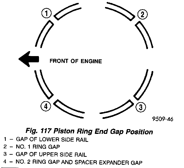 2. Before installing the ring compressor, make sure the oil ring expander ends are butted and the rail gaps located as shown in (Fig. 117). As viewed from top.