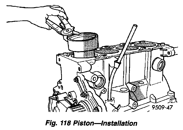 3. Immerse the piston head and rings in clean engine oil, slide the ring compressor, over the piston (Fig. 118). Be sure position of rings does not change during this operation.
