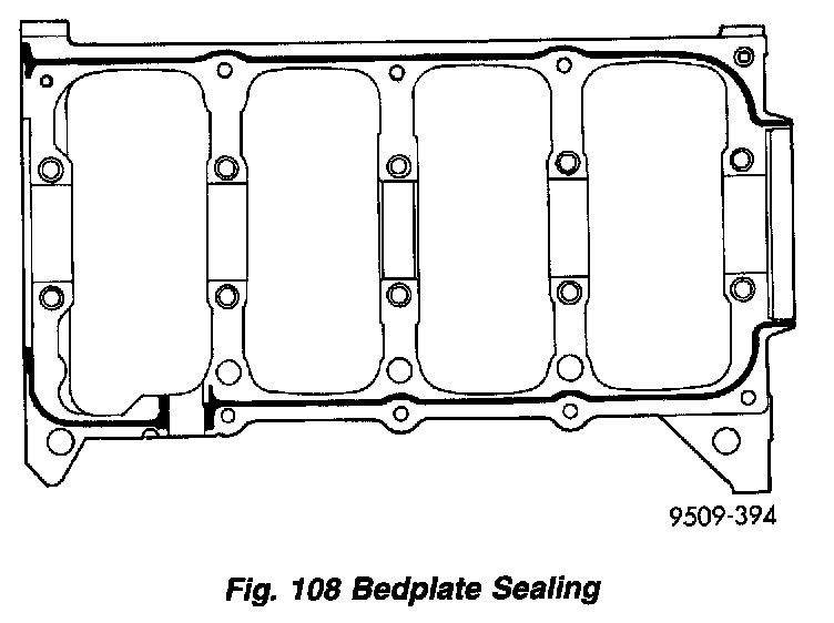 4. Apply 1.5 to 2.0 mm (0.059 to 0.078 inch) bead of Mopar Bed Plate Sealant to cylinder block as shown in (Fig. 108).