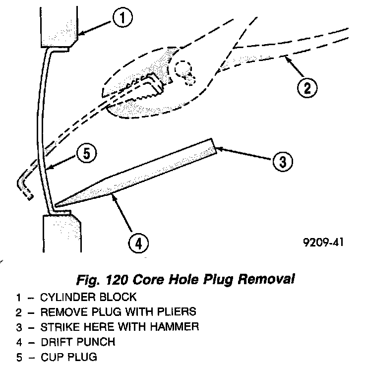 Using a blunt tool such as a drift and a hammer, strike the bottom edge of the cup plug. With the cup plug rotated, grasp firmly with pliers or other suitable tool and remove plug (Fig. 120).