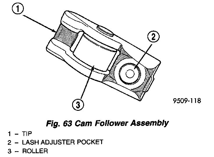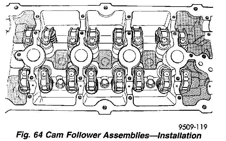 1. Lubricate with clean oil and install cam follower assemblies in their original position on the hydraulic adjuster and valve stem (Fig. 64).