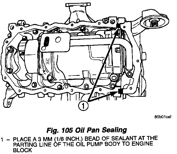 1. Apply Mopar Engine RTV GEN II at the oil pump to engine block parting line (Fig. 105).