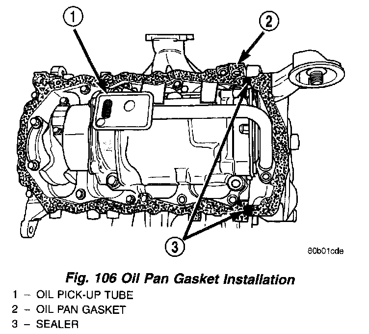 2. Install the oil pan gasket to the block (Fig. 106).