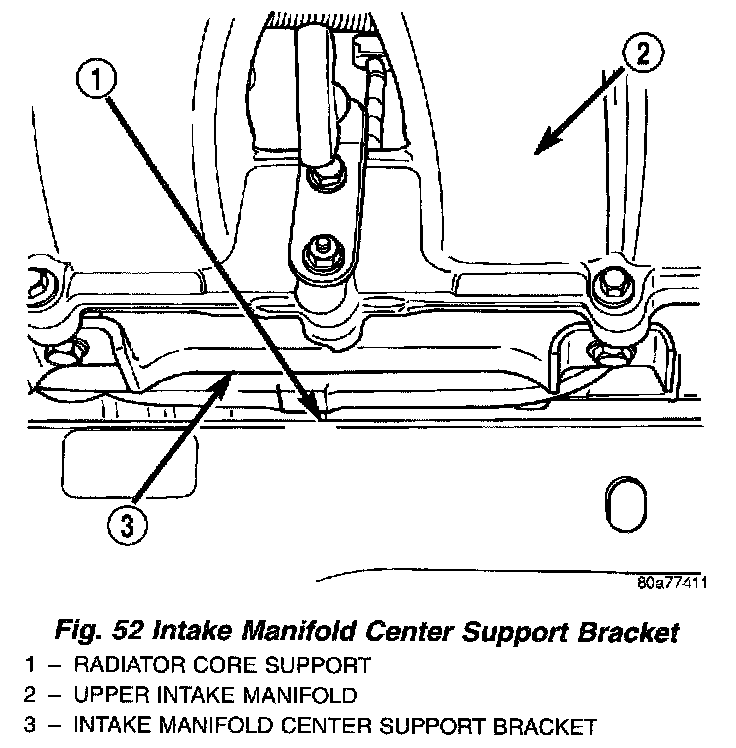 10. Remove intake manifold bracket bolts (Y bracket) (Fig. 52). center support
