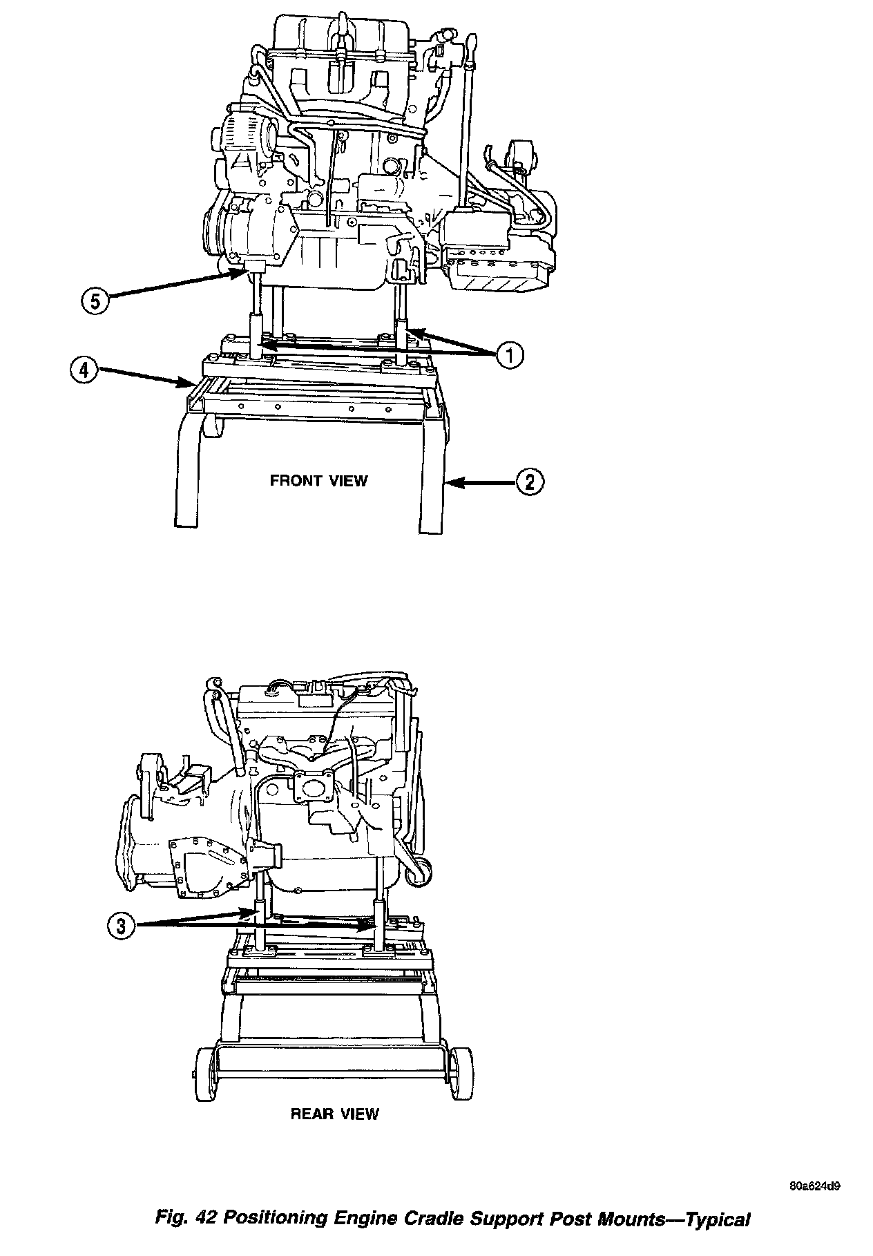 25. Raise vehicle enough to allow engine dolly Special Tool 6135, cradle Special Tool 6710 with Posts Special Tool 6848 and Adaptor Special Tool 8130 to be installed under vehicle (Fig. 42).