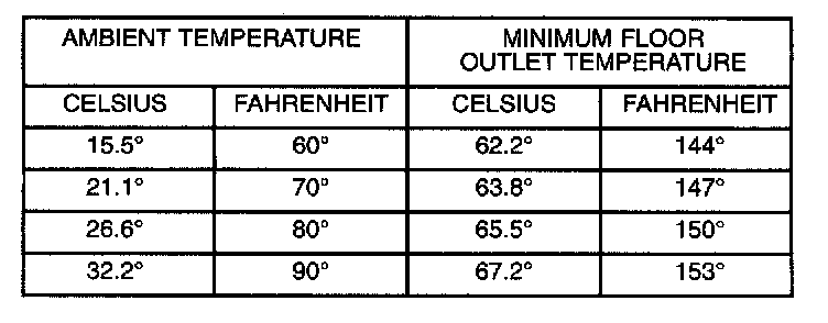 Engine coolant is provided to the heater system by two 16 mm (5/8 inch inside diameter) heater hoses. With engine idling at normal running temperature, set the control to maximum heat, floor, and high blower setting. Using a test thermometer, check the air temperature coming from the floor outlets, refer to Temperature Reference Table.