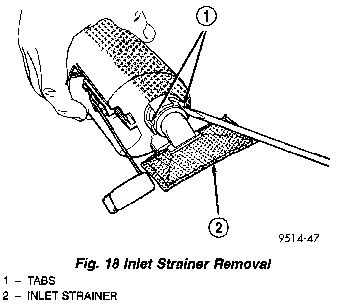 2. Using a thin straight blade screwdriver, pry back the locking tabs on fuel pump reservoir and remove the strainer (Fig. 18).