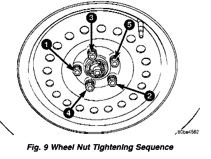 2. Progressively tighten the 5 wheel nuts in the proper sequence until tightened to half of the specified torque. Continue to tighten the wheel nuts in the proper sequence until a torque of 135 Nm (100 ft. lbs.) is achieved at each nut.