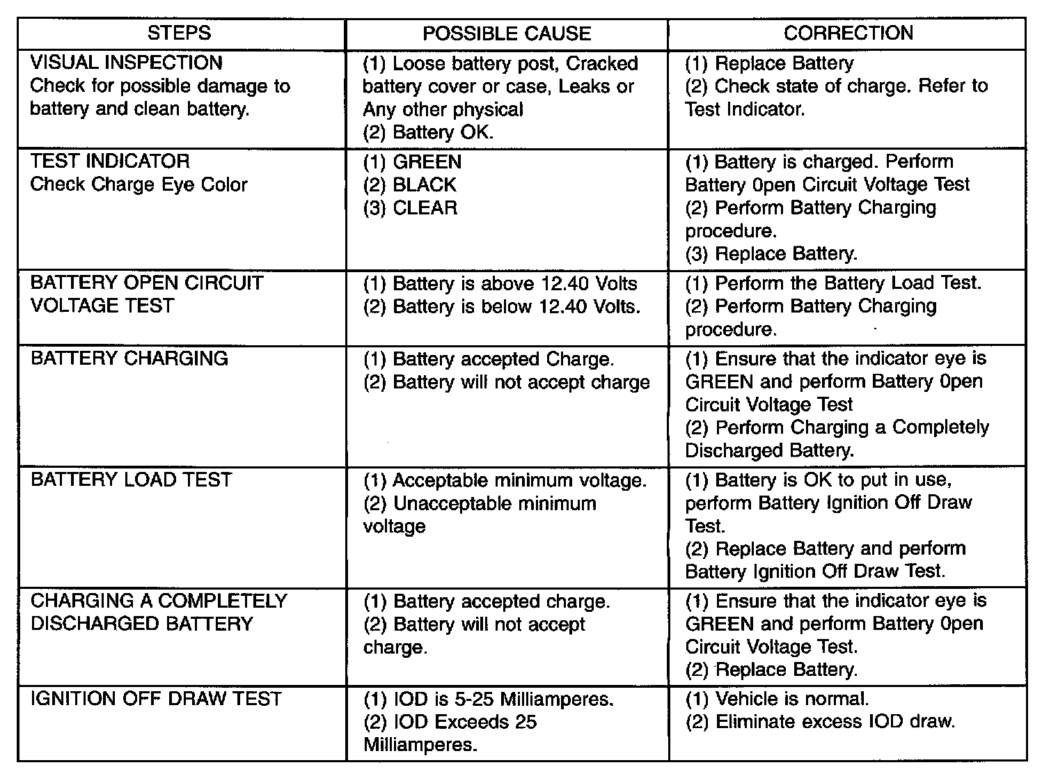 It is normal to have a small 5 to 25 milliamperes continuous electrical draw from the battery. This draw will take place with the ignition in the OFF position, and the courtesy, dome, storage compartments, and engine compartment lights OFF. The continuous draw is due to various electronic features or accessories that require electrical current with the ignition OFF to function properly. When a vehicle is not used over an extended period of approximately 20 days the IOD fuse should be pulled. The fuse is located in the power distribution center. Disconnection of this fuse will reduce the level of battery discharge. Refer to Battery Diagnosis and Testing table and to the proper procedures.