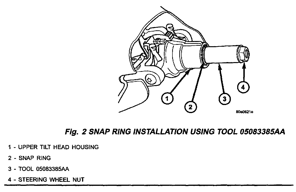 21. From the parts package, use special tool 05083385AA (Installer) and place it over the steering shaft so the one edge of the tool is resting on the snap ring (Fig. 2).