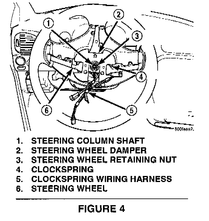 8. Disconnect the wiring connectors from the air bag, horn switch wire and speed control switches. Remove the wiring harness routing clip from the air bag module studs. If the vehicle is equipped with steering wheel mounted radio controls disconnect the radio control wiring connector from the clock spring (Figure 4).