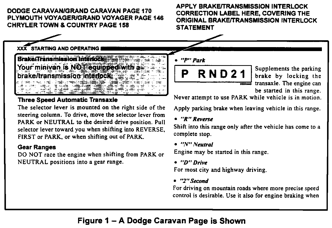 ^ For Dodge Caravan/Grand Caravan, place the label over the "Brake/Transmission Interlock" statement found on Page 170 of the Owner's Manual.