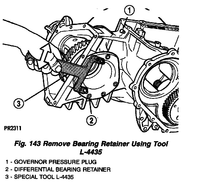8. Remove bearing retainer from transaxle. Use to L-4435 to aid in removal by rotating retainer out of assembly (Fig. 143). Clean surfaces of old adhesive prior to reassembly.