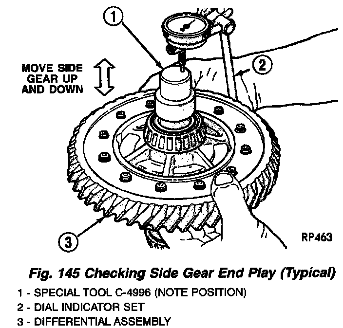11. Measure and record differential side gear end play using dial indicator C-3339 and Tool C-4995.5Gas shown in (Fig. 144) and (Fig. 145). Side gear end play must be within 0.001 - 0.013 inch Replace differential assembly if outside this range.