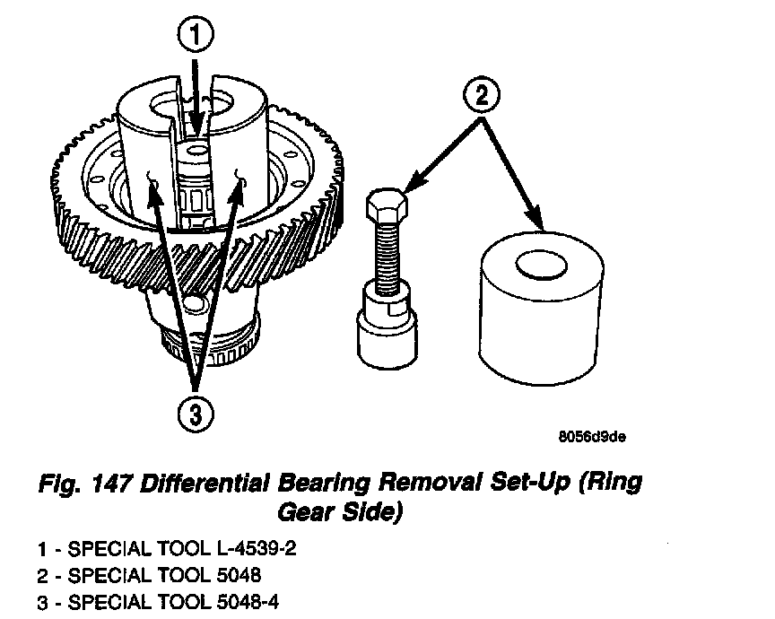 13. Set up tools as shown in (Fig. 147) and (Fig. 148) to facilitate differential bearing removal from ring gear sloe.