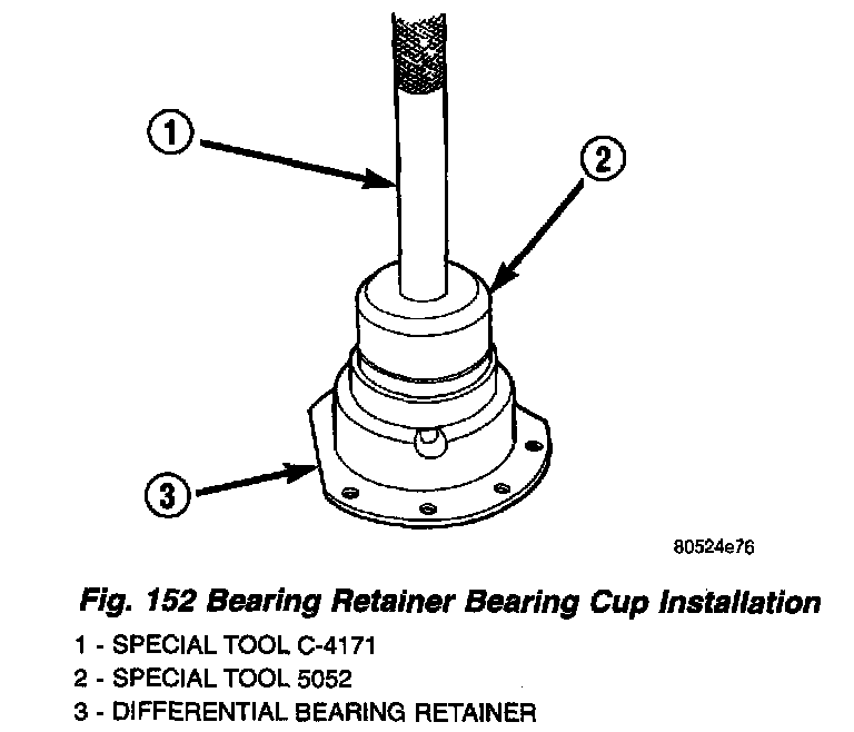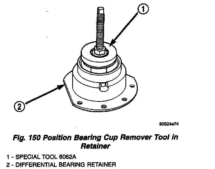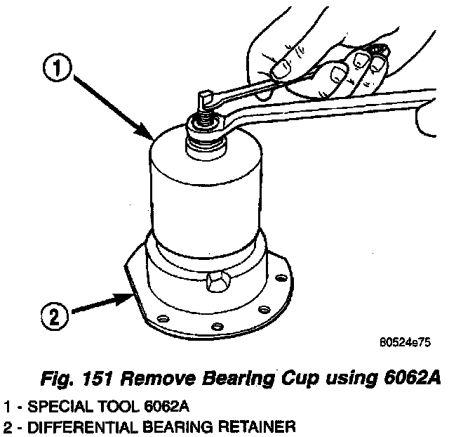 15. Remove bearing retainer bearing cup using Tool 6062A (Fig. 150) (Fig. 151). Remove shim and oil baffle.
