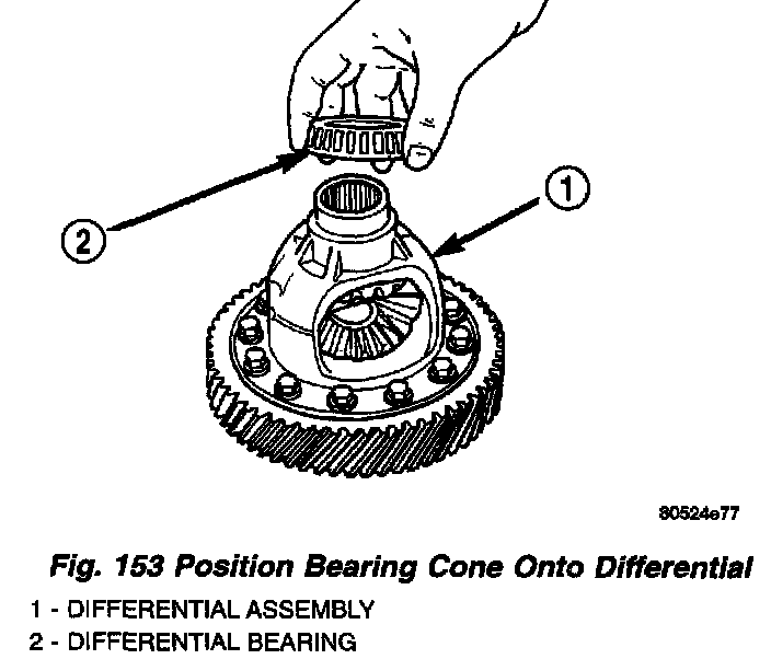 2. Position bearing cone onto differential (Fig. 153), and install bearing cone using TOOL 6536 and driver handle C-4171 (Fig. 154).