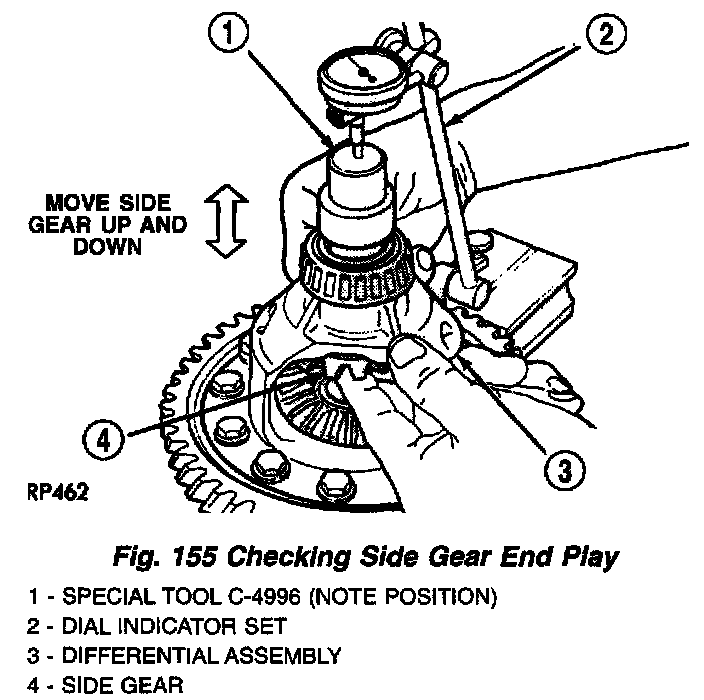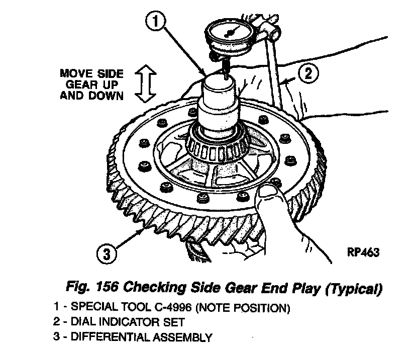 3. Measure side gear end play using dial indicator C-3339 and Tool C-4996 (Fig. 155) (Fig. 156). Side gear end play must be between 0.001 and 0.013 inch.