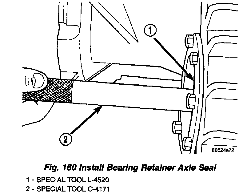 10. Install bearing retainer axle seal using Tool L-4520 (inverted), and driver handle C-4171 (Fig. 160).
